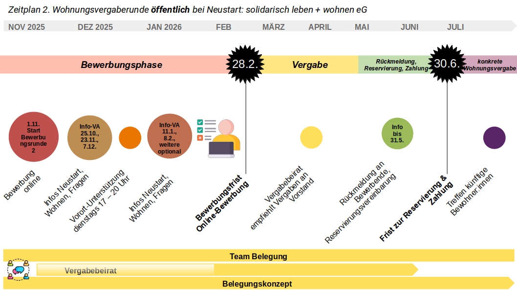 Die Bewerbung in der zweiten Wohnungsvergaberunde ist ab dem 1.11.2025 möglich. Die Bewerbungsfirst endet am 28.2.2026. Die Bewerbung erfolgt über ein Online-Formular. Begleitend finden mehrere Informationsveranstaltungen, sogenannte „Wohninfos“ statt. Wöchentlich immer dienstags bieten wir eine Beratung und Unterstützung zur Bewerbung an. Nach der Bewerbungsfrist prüft der Beirat zur Wohnungsvergabe alle anonymisierten Bewerbungen entlang der im Belegungskonzept definierten Kriterien und spricht Vergabeempfehlungen an den Vorstand aus. Bis zum 31.05.2026 erhalten alle Bewerbenden eine Rückmeldung mit Zu- oder Absage. Spätestens dann müssen sie Mitglied in der Genossenschaft werden. Mitglieder mit einer Zusage erhalten vom Vorstand eine schriftliche Reservierungsvereinbarung als Vorvereinbarung zum Mietvertrag. Sie unterzeichnen die Reservierungsvereinbarung und leisten die Zahlung der Wohnpflichtanteile bis 30.06.2026. Im Juli 2026 wird ein Treffen zum Kennenlernen, Ankommen und Mitmachen für künftige Bewohner:innen stattfinden. Die Wohnungsvergabe der spezifischen Wohneinheit erfolgt danach in einem gemeinsamen Prozess.