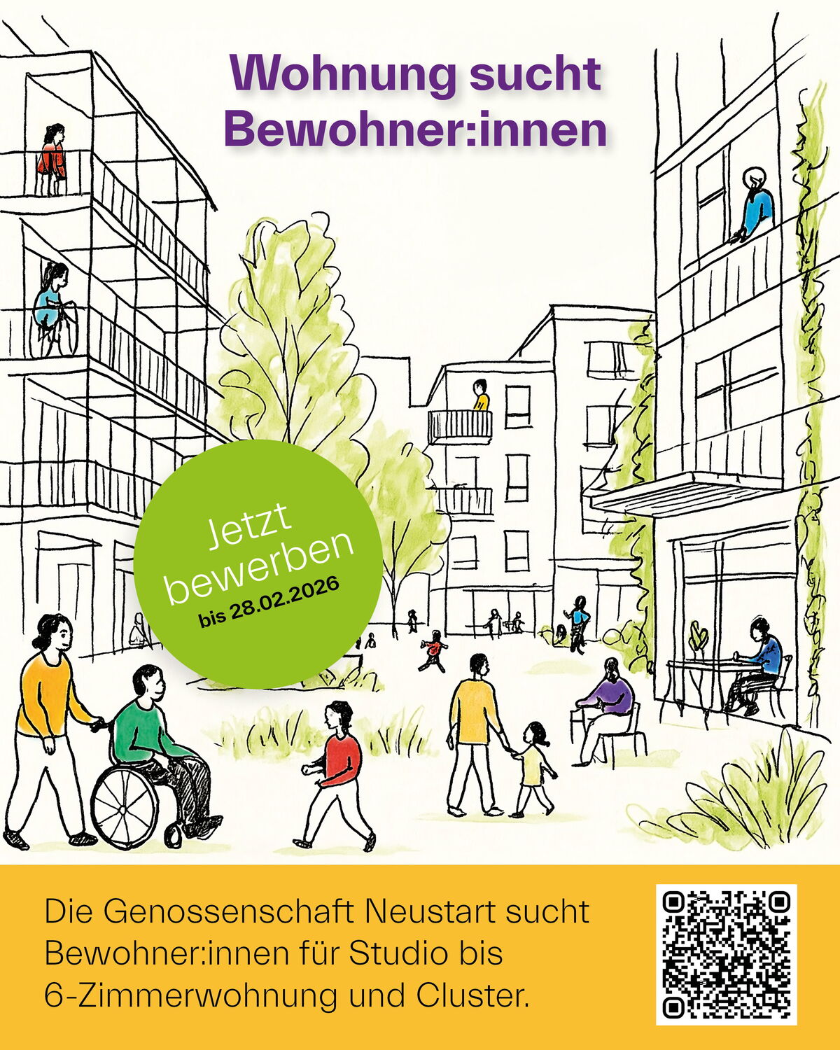 Die Wohnungsvergabe bei Neustart erfolgt in mehreren Runden. Die erste genossenschaftsinterne Runde wurde im April 2025 abgeschossen und die ersten 120 künftigen Bewohner:innen in 75 Haushalten und Wohnungen stehen fest und gestalten die Genossenschaft aktiv mit. Die zweite Wohnungsvergaberunde von Neustart zur Vergabe weiterer circa 50 Wohnungen an circa 120 Personen ist öffentlich. Sie hat am 1.11.2025 begonnen und endet am 28.02.2026. Die dritte öffentliche Wohnungsvergaberunde findet voraussichtlich im Herbst 2026 statt. Die Wohnungen für soziale Träger werden separat vergeben. Nach der Erstvergabe werden einzelne frei werdende Wohnungen nachvermietet.